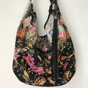 Vegan Floral embellished purse 🌸 Vegan non-leather material trim, strap, and tassel 🌸 Soft fabric feel inner lining 🌸 one Side embellished, the other is not so that it won’t rub against your clothing. 🌸 outside zip pocket 🌸 zip closure 🌸adjustable length strap drop 🌸 Approx 17” across, 14” long 🌸It is adjusted to its shortest currently- strap to bottom is approx 31” (hits me just above my knee- I’m 5’3” for reference