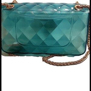 Vegan Jelly Style Teal Color Turn Lock Cassette Gold Chain Handbag.