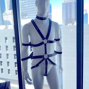 Removable collar and arm straps. One size fits most. Made of quality vegan (PU) leather.