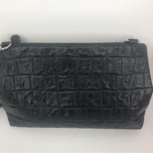 Vegan Leather Convertible Crossbody Fold Over Handbag. Croc embossed black faux leather with silver hardware. Crossbody chain can be removed and use your purse as a clutch! This purse is so roomy! The back has one large pocket with its own zipper closure. Open up the fold and there’s one very large inner pocket with a small side zipper pocket and a couple of open side pockets. Then there is even another large zipper pocket outside of the fold over part. You can fit all your daily essentials in here and then some! EUC! 13x9x3. Strap drop approximately 24”