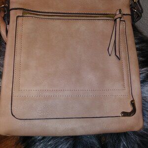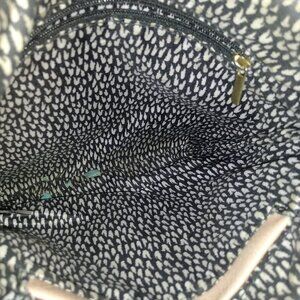 This bag has been "the little engine that could" for me. Purchased at Ross and unbranded it held up through many trips downtown, errand running and carpooling. It is still in fantastic shape, and I would love someone to get as much use as I did from it. the lovely blush color is neutral enough for any outfit and the zippered outside pocket was my favorite feature. It was the perfect place to slip my keys and cell phone. I know it's next owner will love this little wonder. The interior has a zippered pocket and slip pocket and lovely black and white print. 10" H x 9" W.