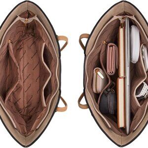 Features: Stylish oversized tote in vegan leather with flat top handles and a sleek zipper closure. Spacious interior with multiple pockets — including a side zippered pocket and two open compartments — you can organize all your essentials effortlessly. The clean, modern silhouette makes it versatile for both office and weekend looks.