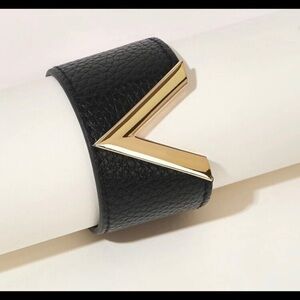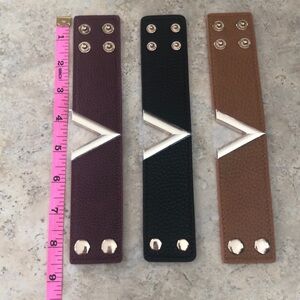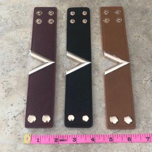NWOT. Vegan leather “V” cuff bracelet with snap closure. Available in three colors: burgundy/gold, black/gold and brown/gold.