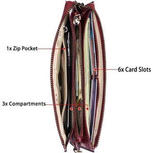 The wristlet purse has 6x credit card slots, 3x long compartment, 1x zipped pocket, also very organized to store your cash, charge, credit cards, driver's license, cell phone and other essentials. Dimensions: 7.67"L x 4.13"W x 0.9"H.