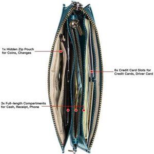 The wristlet purse has 6x credit card slots, 3x long compartment, 1x zipped pocket, also very organized to store your cash, charge, credit cards, driver's license, cell phone and other essentials. Dimensions: 7.67"L x 4.13"W x 0.9"H.