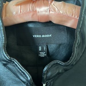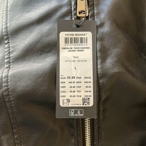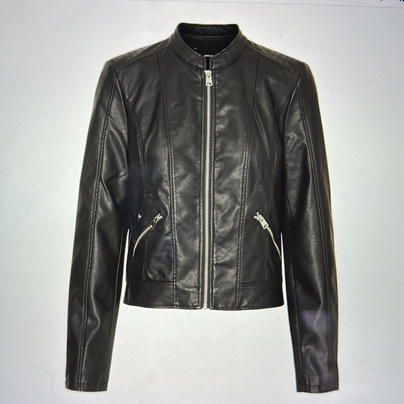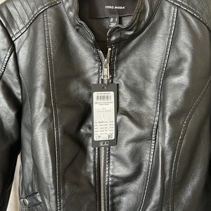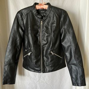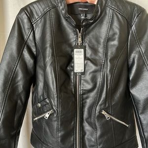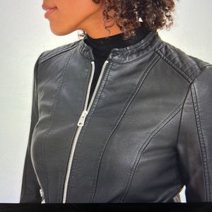 New with tags, faux leather motorcycle jacket Sturdy zipper closure up front center and on pockets. Also one small snap pocket No chemical odor like some faux leathers. Lined and lightweight enough for spring. Super cute. Purchased from