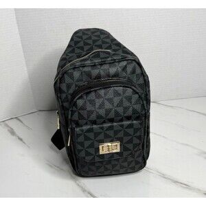 Vegan Sling Backpack Crossbody Geometric Pattern Lead-Free Shoulder Bag in Black