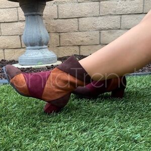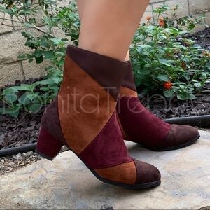 Vegan Suede Color Block Mismatch Ankle Boots These ankle boots have a cute classic silhouette with midi heel, but a fun trendy twist with a mismatched color block style in camel, burgundy and brown. Zipper closure
