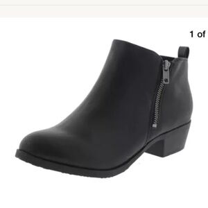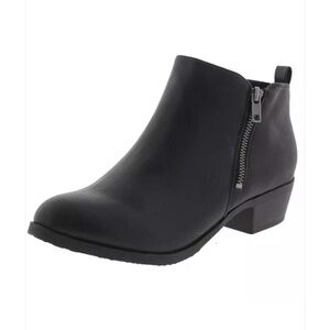 Vegan booties with interior and exterior side zip closures. Fit true to size. 1.5” chunk heel. Vegan leather.