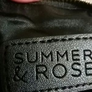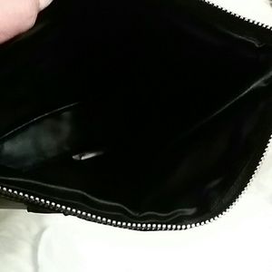 Vegan leather and velvet clutch. Black lining, gold top zip. Folds to 10" × 6". Opens to 12". New, never used with dust bag