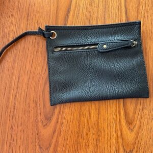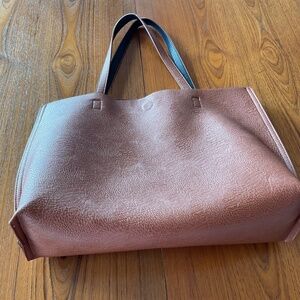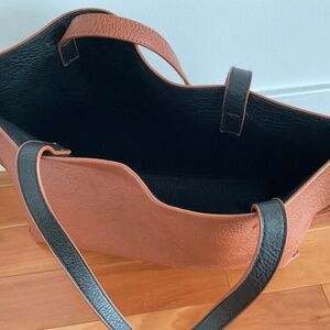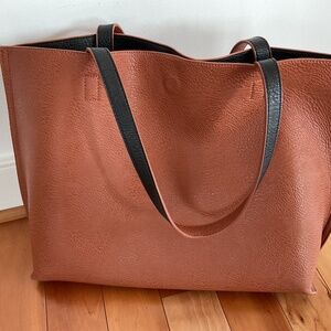 Perfect for work and weekends: roomy lightweight vegan leather tote with magnetic one-button closure and removable flat bottom. Warm brown exterior with black lining. Matching and attachable black zip pouch with brass-tone zipper. Tote measures 19” w x 13” h. Zip pouch measures 7 3/4” x 6 1/4”. Excellent like-new condition.