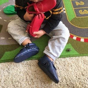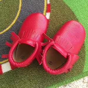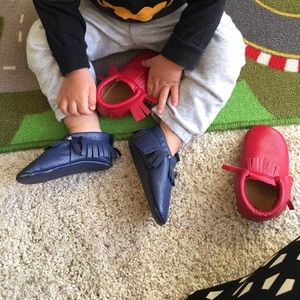 2 pairs of Size 4 toddler, vegan moccasins, purchased at a kids store. Super cute! Red new, blue light wear as seen in photo.