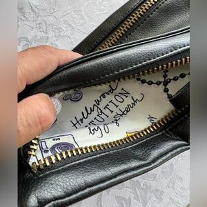 Fun and versatile, has 2 exterior zipper pockets and one interior section with a zipper pocket. Bag is 10 inches wide, 6 inches long , strap is adjustable and removable. Lenyshown in photos is 10 inches long