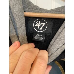 The product is a women's size large Vegas Golden Knights hoodie by 47 Brand, officially licensed by the National Hockey League (NHL). The hoodie is designed in gray color and features the team's logo, making it a stylish and comfortable choice for female fans of the Vegas Golden Knights. Made in China, this pullover hoodie is perfect for showing support for the team during the regular hockey season.