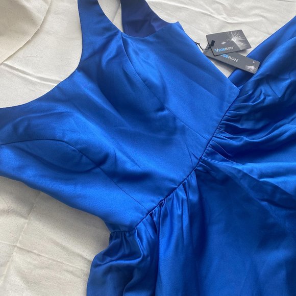 Vegeron short blue formal dress. Size 6. This fabulous sleeveless dress has a structured bodice and boning in the top, a scoop neck at the front, and a plunging V--back. The back has an enclosed zip. 100% polyester. New with tags. Perfect for Summer.