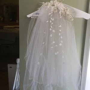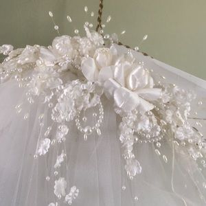 Beautiful lace veil with pearls and flowers. Has comb that places veil in your hair