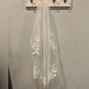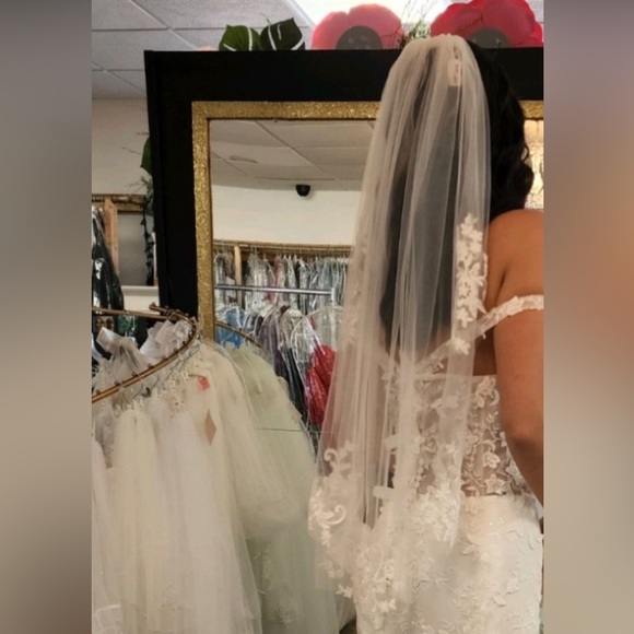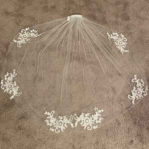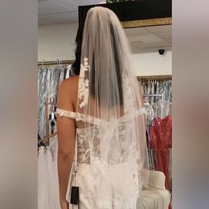 Brand new. Bought this beautiful veil for my wedding, but decided last minute I wanted one with a train and no lace. Would love to see another bride be able to use it! Zero rips/stains and has been properly stored in its original packaging. Smoke free home.