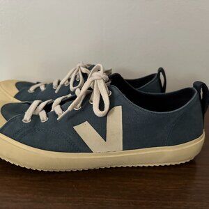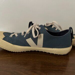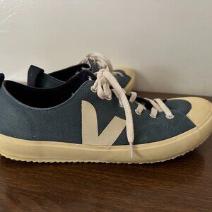 Very cute pair of Veja blue canvas low rise color block sneakers in women's size ten. Used, but in great shape (no wear to tread, though some discoloration from use).