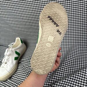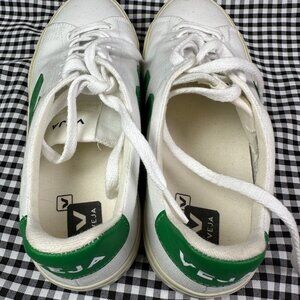 Chic Veja sneakers with green logo detail. White canvas for a fresh look. Perfect for everyday wear.