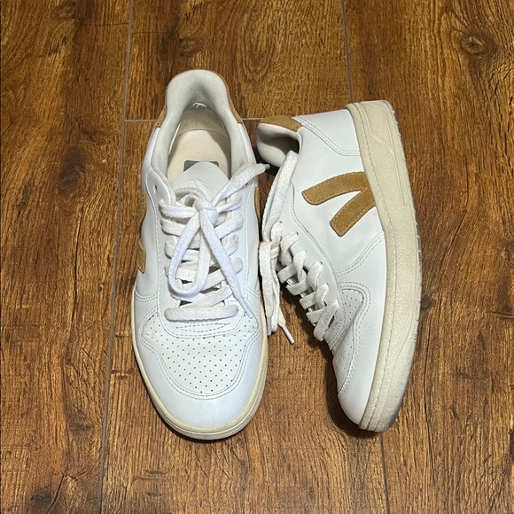 Chic preloved Veja sneakers in white with tan accents. Ideal for everyday style.