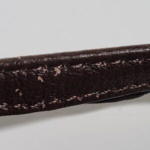 The body and back of the wallet are made of smooth dark brown leather. It includes a detachable brown leather strap with fine stitching, although there is some visible wear on it as shown on the photo, indicating previous use, a compact, dual-compartment design, a front flap pocket and a zippered section.