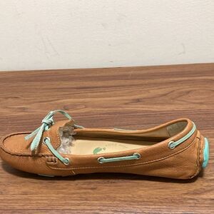 Velez genuine leather moccasin style driving shoes. Cognac with turquoise Ties. Padded insole & leather with rubber traction bars on out sole.