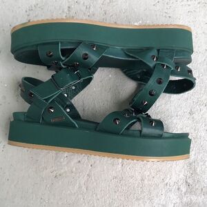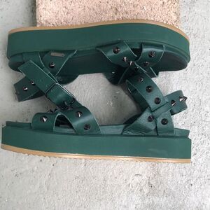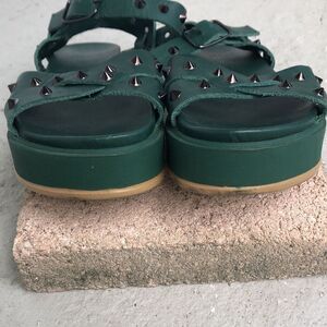 Super cute, studded sandals, with a low platform that measures 1 inch. As you see from the pictures, they are in good condition. Color is like a dark Kelly Green.