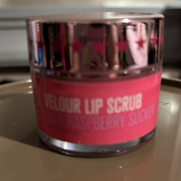 Velour Lip Scrub in a vibrant pink raspberry shade. Perfect for smooth, soft lips.new but no box blue raspberry sucker