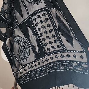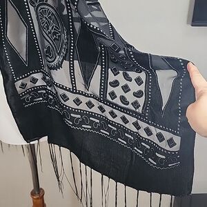 Around 20 inches wide and about 58 inches in length, not counting tassels. Sheer paisley and other print. A few small pulls and one tear photo #9 as shown in photos.