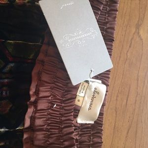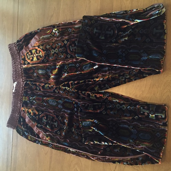 Vintage looking brown print with satin accents. High waisted and trouser fit. Front pockets. Fun for a night out!