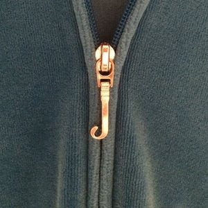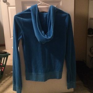 This bright blue, barely worn velour jacket is form fitting and looks new.