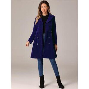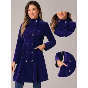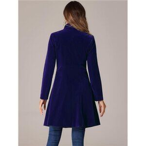 This steampunk coat is made up of several design points: velvet fabric, stand collar, long sleeves, a-line, double breasted, with pockets, fully lined, mid-length, slightly stretchy