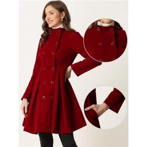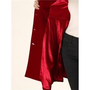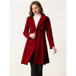This steampunk coat is made up of several design points: velvet fabric, stand collar, long sleeves, a-line, double breasted, with pockets, fully lined, mid-length, slightly stretchy
