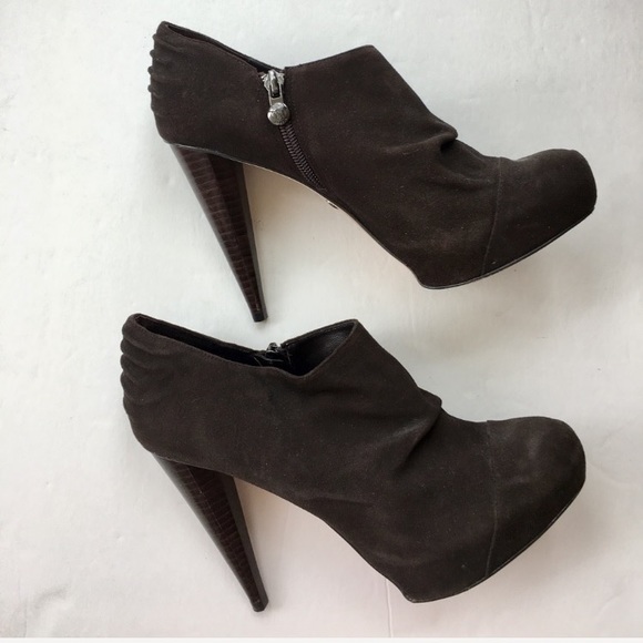 Velvet Angels Booties - super cute worn twice- side zip - hidden platform for extra comfort and height. No stains or marking on on any visible part of shoe except on the bottom of sole. Make a statement the next time you put on your jeans and favorite blouse or sweater!