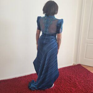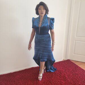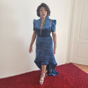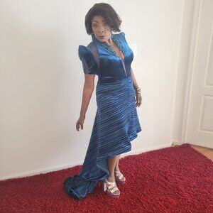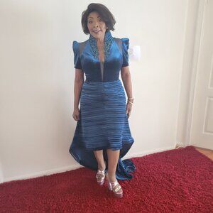This elegant green dress features a dramatic high-low hemline, perfect for a night out. The sheath style adds a playful touch to its sophisticated silhouette.