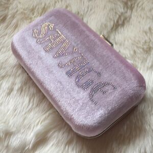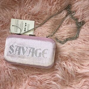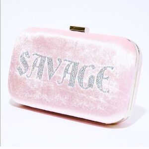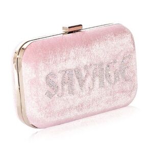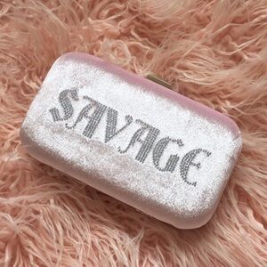 Savage Hard Shell Clutch. This velvet clutch says SAVAGE with jewel embellishments and a clamp closure.