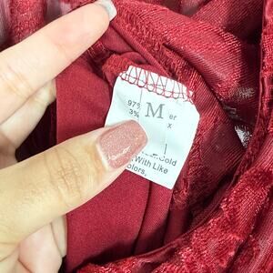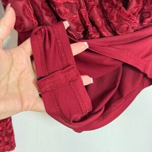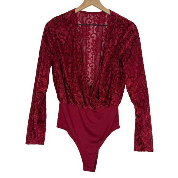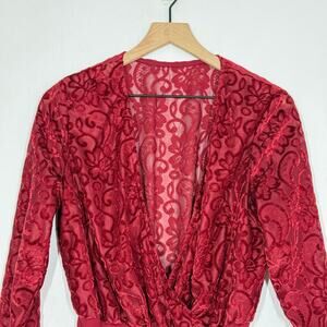 Velvet Burnout Bodysuit Size Medium Red Floral Lace Plunge V-Neck Long Sleeve