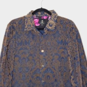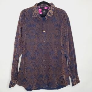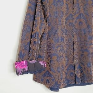 1 Like No Other Rare Velvet Burnout Long Sleeve Men's Button-up Shirt 2XL. Cotton shirt in a Brown and Navy Burnout with a Scroll/Egyptian/Abstract print.