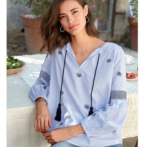 Designed for comfort and compliments. Tassels, blouson sleeves, and embroidery over subtle stripes.
