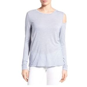 A slim and silky long-sleeve tee is updated with a flirty shoulder cutout. Crewneck Long sleeves Made in the USA Fiber Content: 64% viscose, 36% polyester Care: Machine wash, tumble dry Note: Navy and White (pic is lighter)