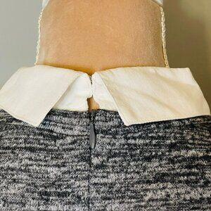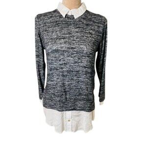 Marled black and white knit long sleeved lightweight sweater "twofer" top layered look solid white button collar, sleeve cuffs and hem. Super soft, back neck zip with hook/eye closure. Made in USA. Polished layered look without bulk. Perfect for any occasion, it pairs seamlessly with skirts, trousers, or jeans. Longline tunic length, curved hem. Marled knit gives is the appearance of textured fabric.