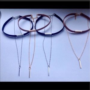 Brown or black velvet, gold-tone or silver-tone... Select from 4 different styles at checkout! Soft, faux leather 3/8" wide collar band measures 12.5" plus a 2" extender chain for optimum fit. Lovely triangular chain dangles 9" below the choker, complimented by a brilliant 1" bar pendant. Beautiful quality! Hot, celebrity style! We ship fast, and include a free NWT gift with every order. 🎁 (9)