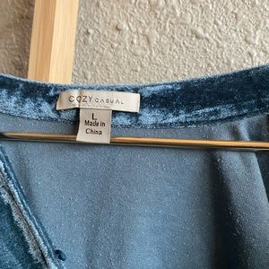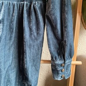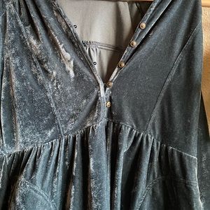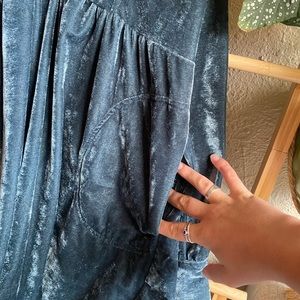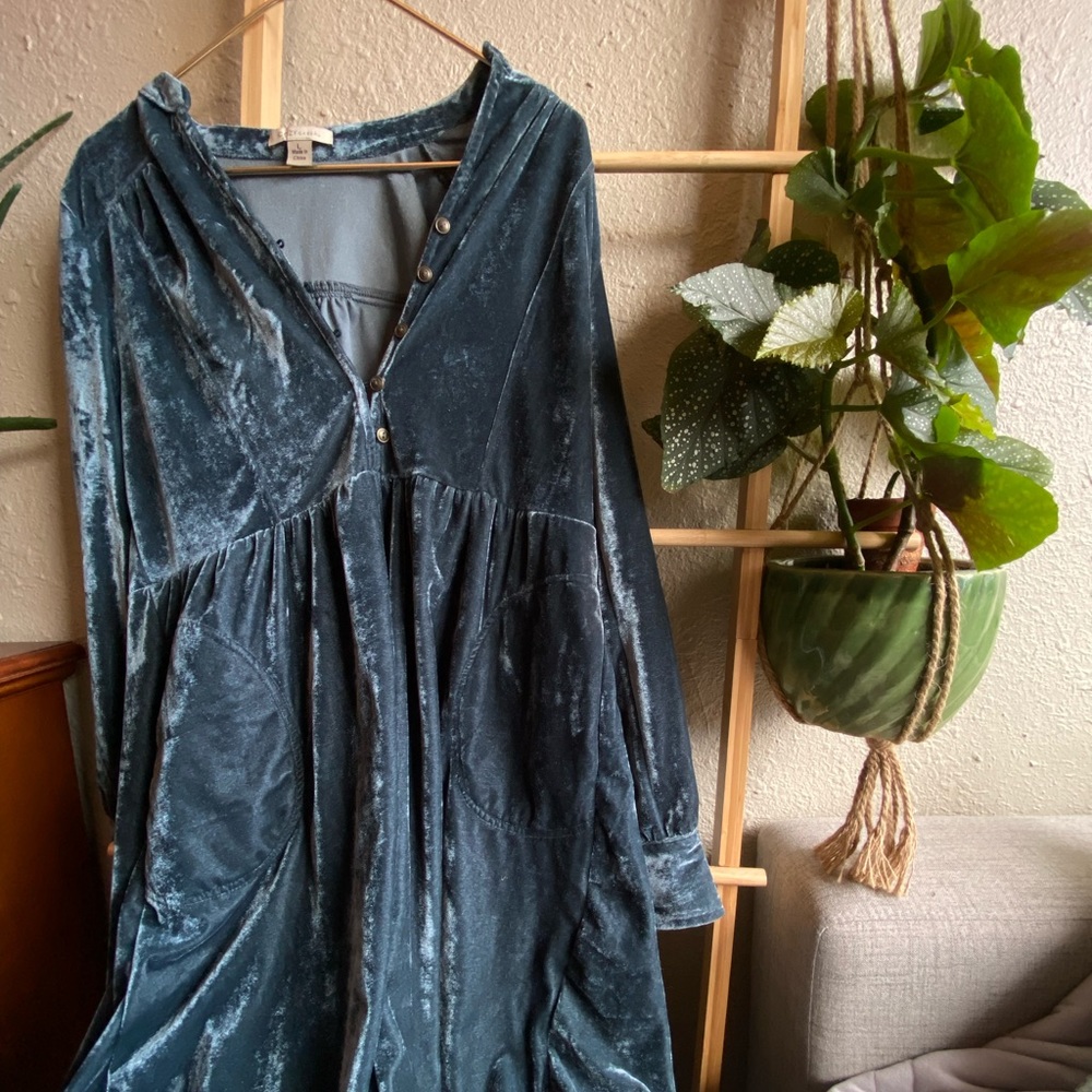 Deep Turquoise velvet dress with pockets! I’m petite and wore this super oversized and it hung nicely, but it would certainly work better on a true size large. Great condition.