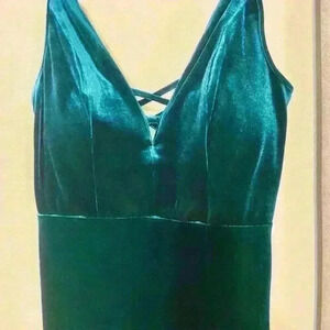 Brand new, size 1, peacock blue/teal long velvet dress with slit on leg of dress. Zips on the side to get on and off easier.
