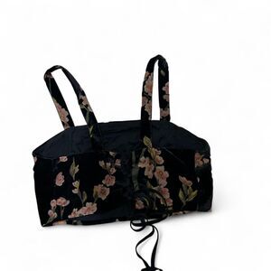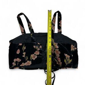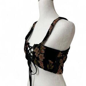 black floral velvet, lace-up crop top, gothic style, grunge fashion, coquette vibe, corset-inspired, kawaii edgy, velvet fabric, floral pattern, alternative top