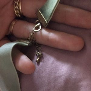 Throw it back to the 90’s! This velvet green choker will elevate any outfit you wear. It has great detail at the ends of the fabric and a beautifully functioning spring clasp closure with a trailing chain detail so that it can be adjusted in length. There is a stain inside the necklace but completely undetectable when worn. A perfect piece for the upcoming holidays.