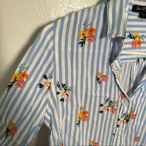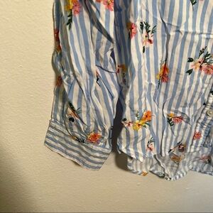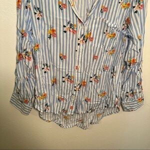 Great condition, minor wear. Velvet heart. Button down blouse. White and blue stripes with multicolor floral pattern. Roll tab sleeves. High low hem. Style 2CG-201619. Size XS. 100% rayon. Pit to pit laying flat 18” Shoulder to hem 21”/23” Sleeve (pit to hem) 16”. All measurements are approximate and taken laying flat. Smoke free home. No trades, offers welcome.