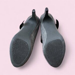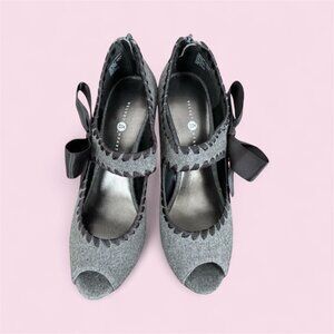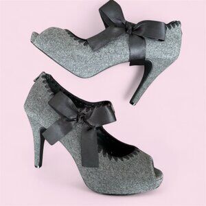 Slip into these absolutely beautiful heels from the Velvet Heart collection. They are super attractive and feature a zipper closure at the back ankle for easy wear. To enhance its charm, there is a black satin bow and cute peep toe. While the fabric is not specified, it appears and feels like wool or a type of flannel. This shoe is simply gorgeous! It is pre-owned but remains in like-new condition!