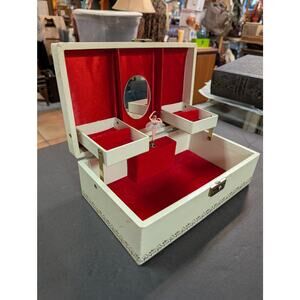 Velvet Jewelry Box Music Box with Mirror inside. Octagon shaped Vintage Jewelry Holder Organizer Vintage Jewelry Box. Music Box plays Dr Zhivago Lara's Theme Tune Song very well. Deep Burgundy Red Velvet with Bright Gold Metal Trim. Lovely. Good vintage condition, music box plays and turns off when lid closes. Several creases in velvet but no tears nor stains. Scratches on metal inside and lid doesnt close exactly straight without nudging it. See photos and video with sound.
