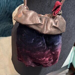 A stunning bucket bag in a luxurious velvet, in a luscious color of burgundy, indigo and brown tie die pattern adorned with two red velvet roses serving as both a beautiful accent and a unique drawstring closure. Wear easily as a crossbody or on the shoulder for everyday elegance.